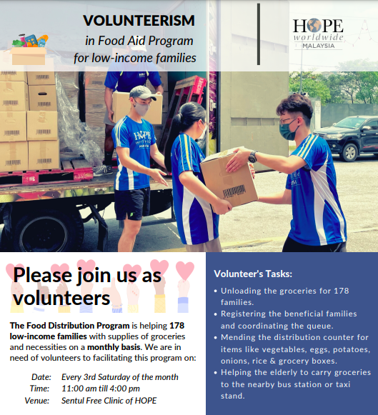 Looking for a fulfilling way to serve community? Join Amazing Seniors and volunteer with our collaboration with HOPE Worldwide Malaysia's Food Aid Program for low-income families. You can assist to unload groceries, register families and distribute much-needed supplies.