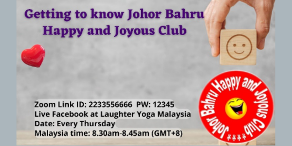 Join Johor Bahru Happy and Joyous Club daily Zoom laughter sessions. Session held on: Monday – Friday (9.00am - 9.30am) Saturday - Sunday (2.00pm - 2.30pm) Zoom ID: 2233556666 Password: 12345 And also Zoom sessions on 'Getting To Know Johor Bahru':- Thursday (8.30am – 8.45am) Zoom ID: 2233556666 Password: 12345 For further info: Contact Ms Lee-Jean at 016-716 1480